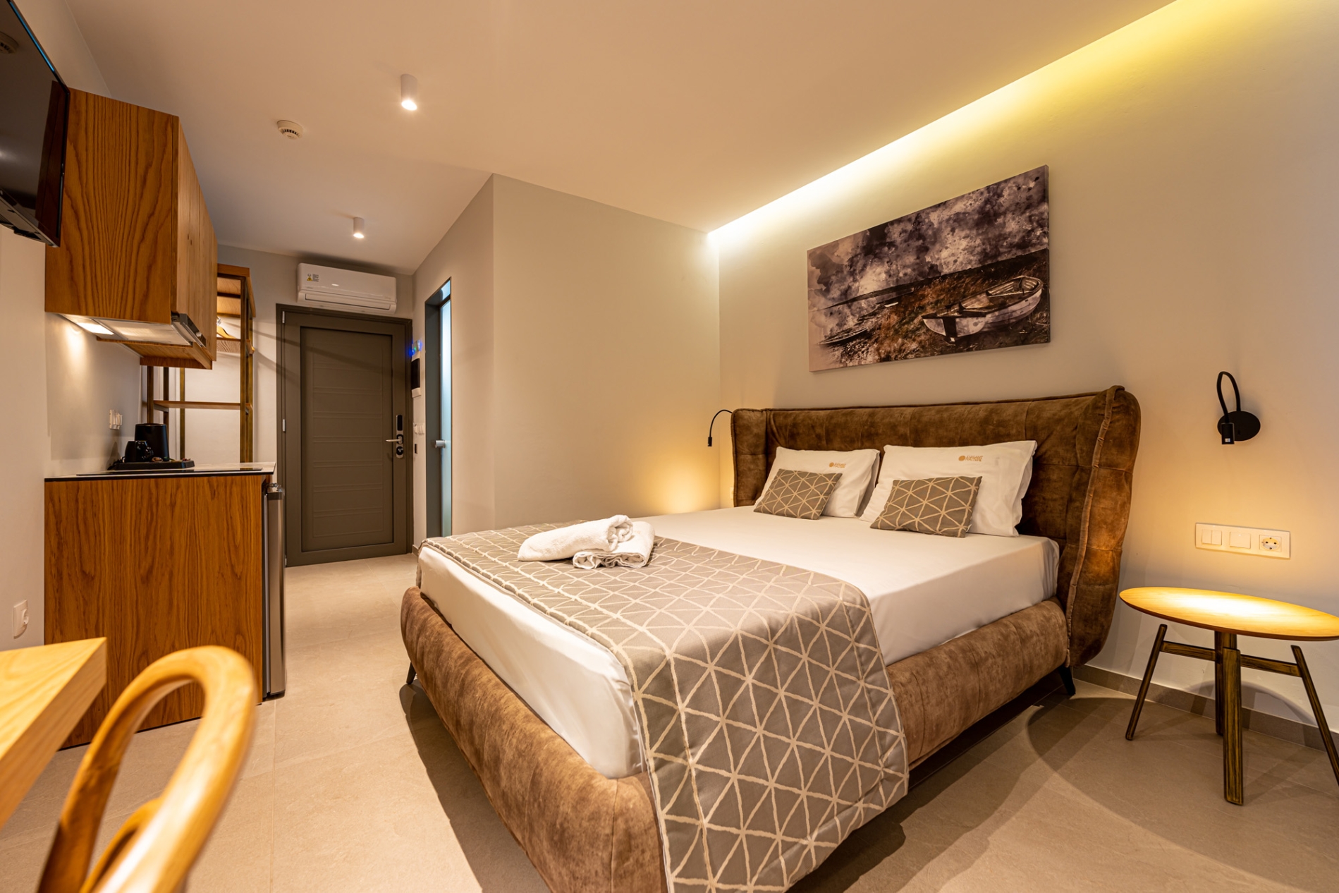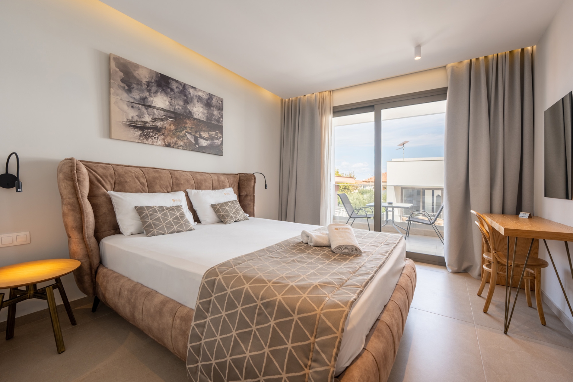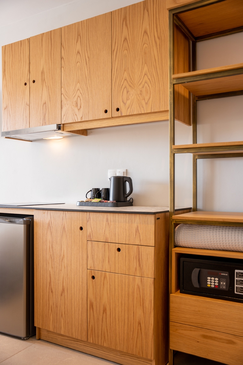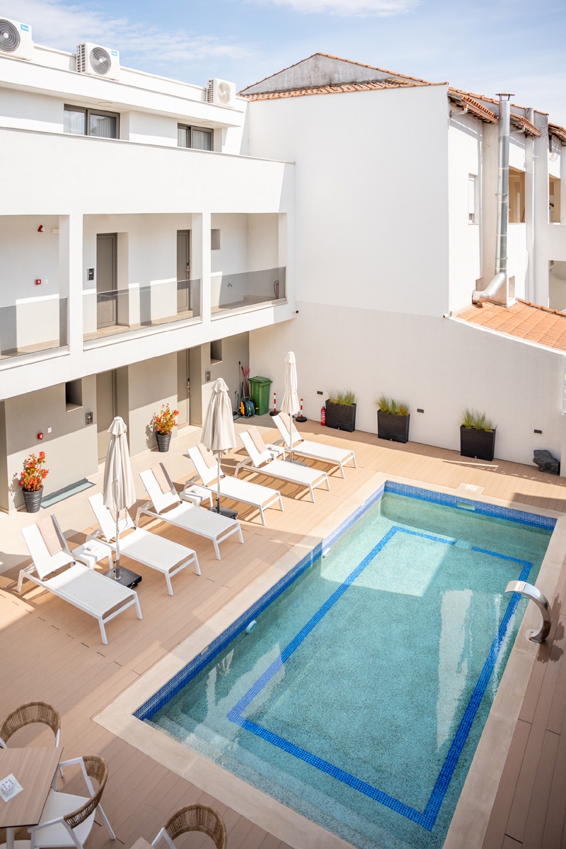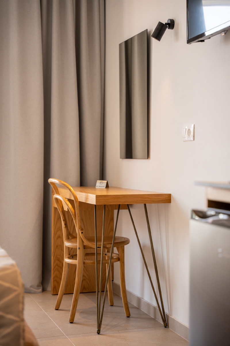The Double Room with Pool View is located on the second floor and features a private balcony overlooking the pool. With a queen-size bed and bright, functional space, the room provides a comfortable and calm stay for couples or two guests, with modern, warm décor that creates a welcoming atmosphere.