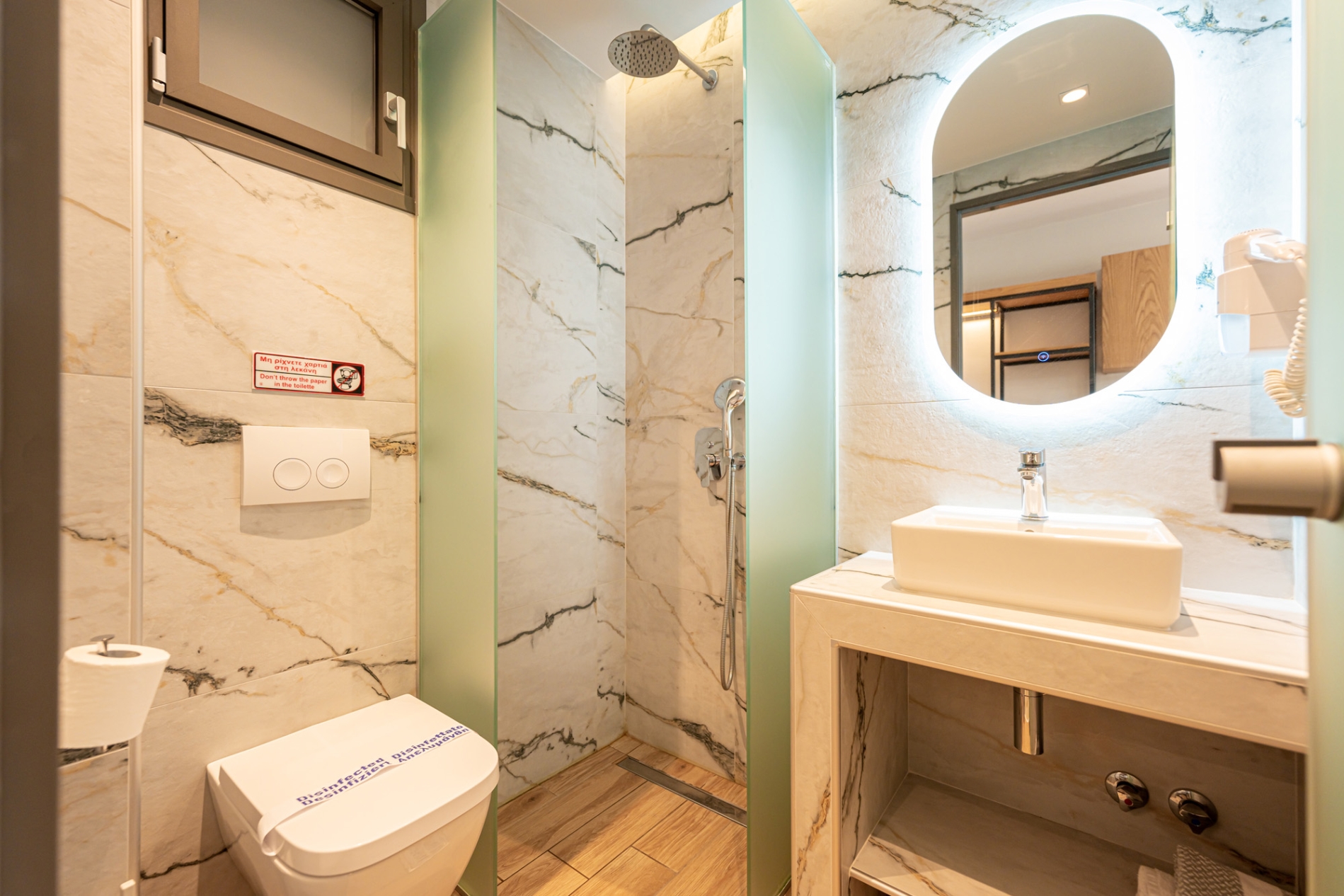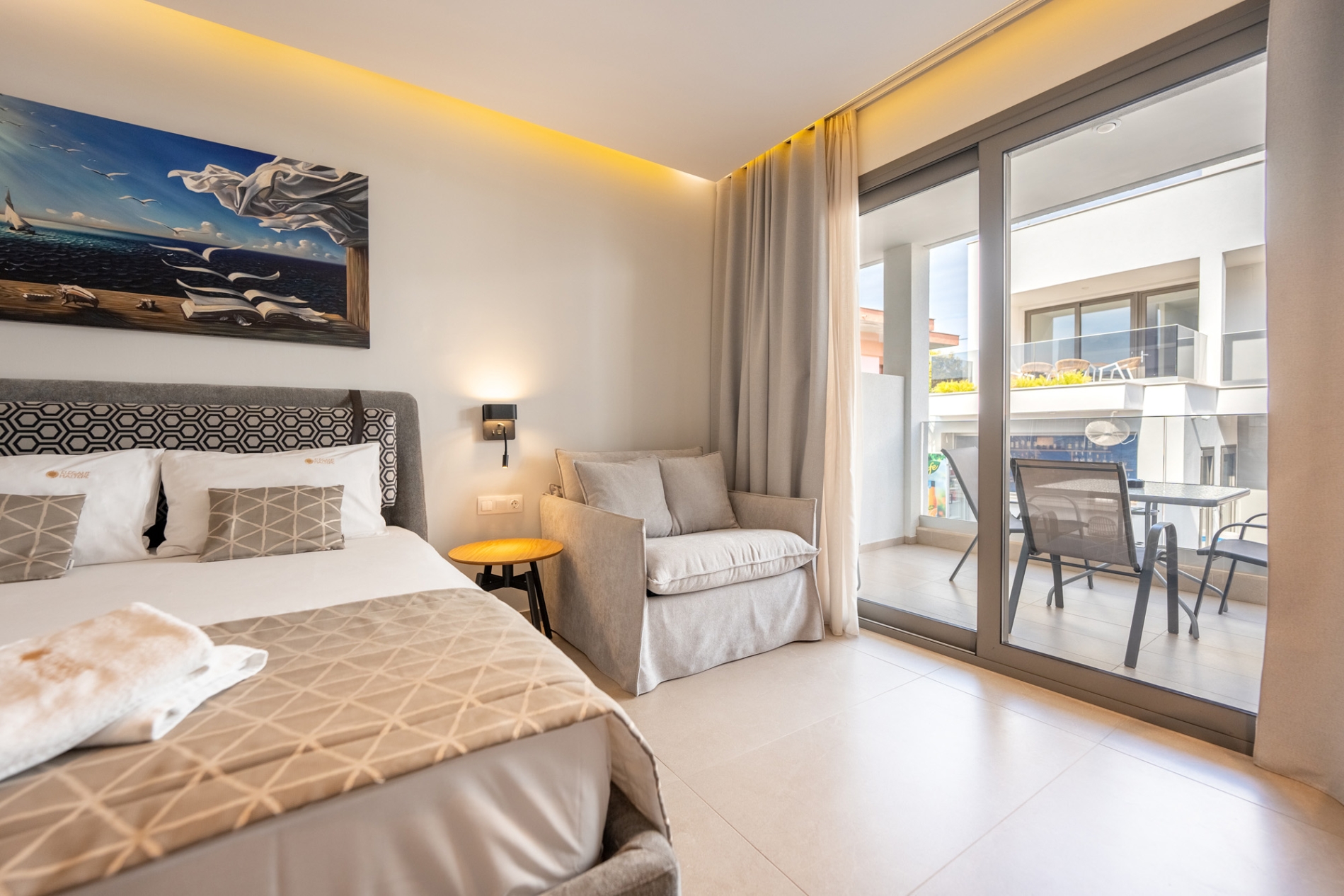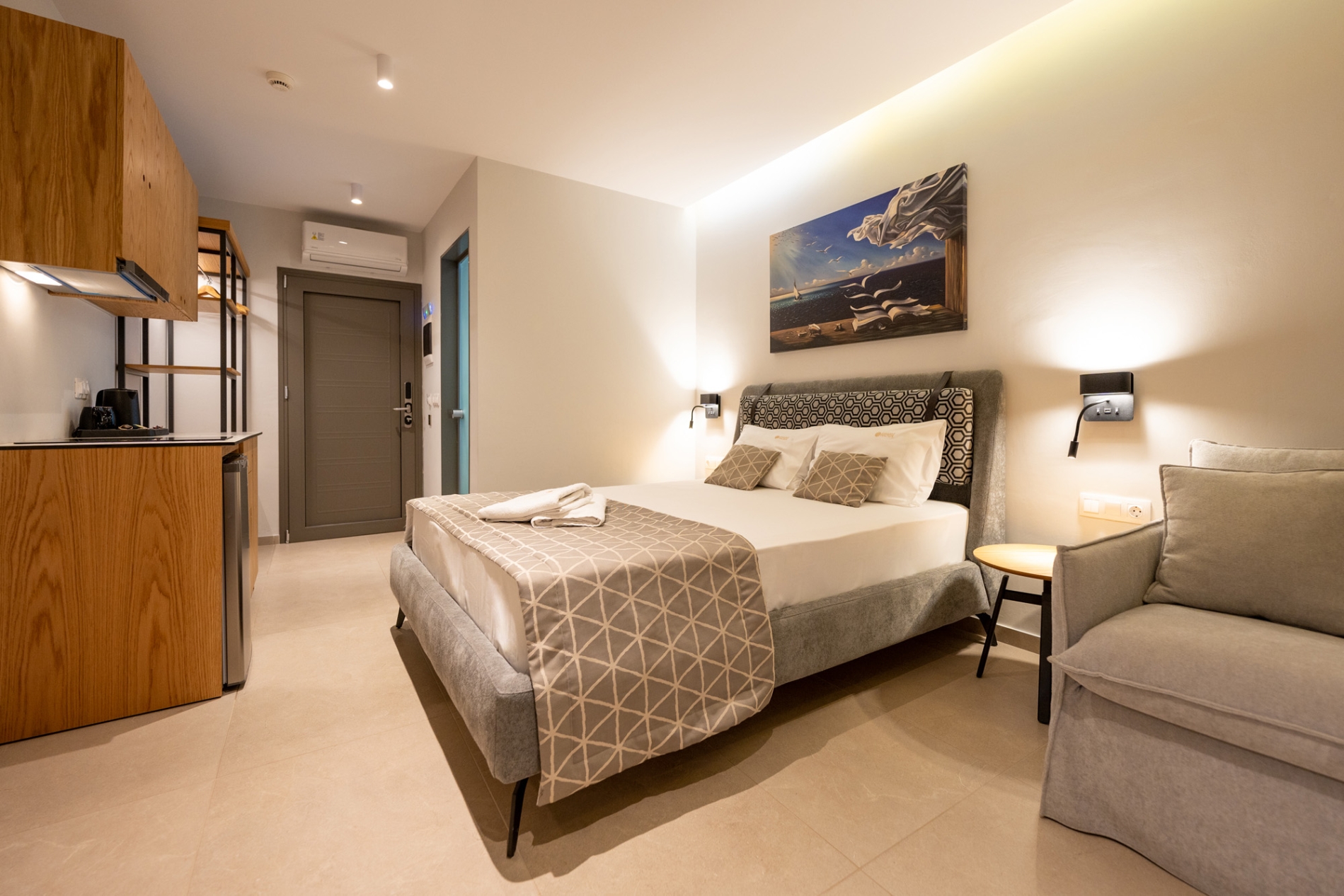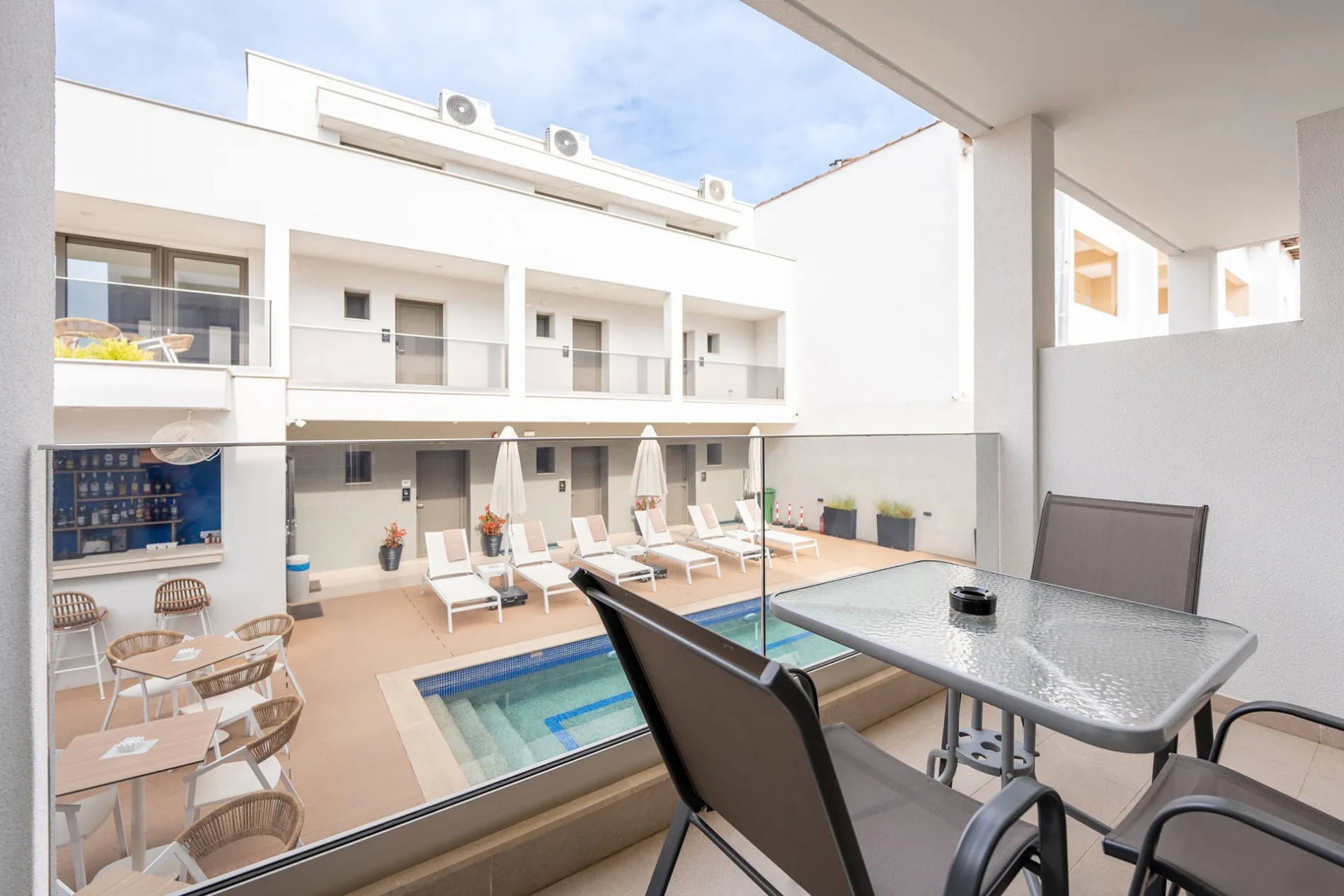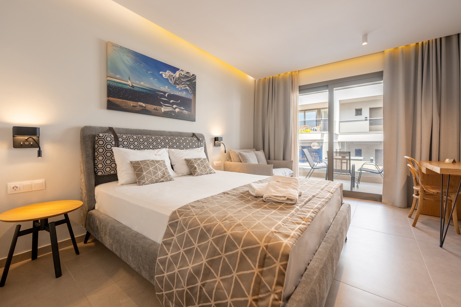 The Triple Room with Pool View is located on the first floor and features a private balcony overlooking the pool. With a queen-size bed and sofa bed, it is ideal for small families or up to three guests. The modern, minimalist décor creates a calm and welcoming environment for a relaxing stay.