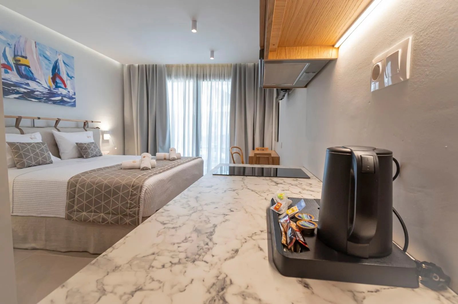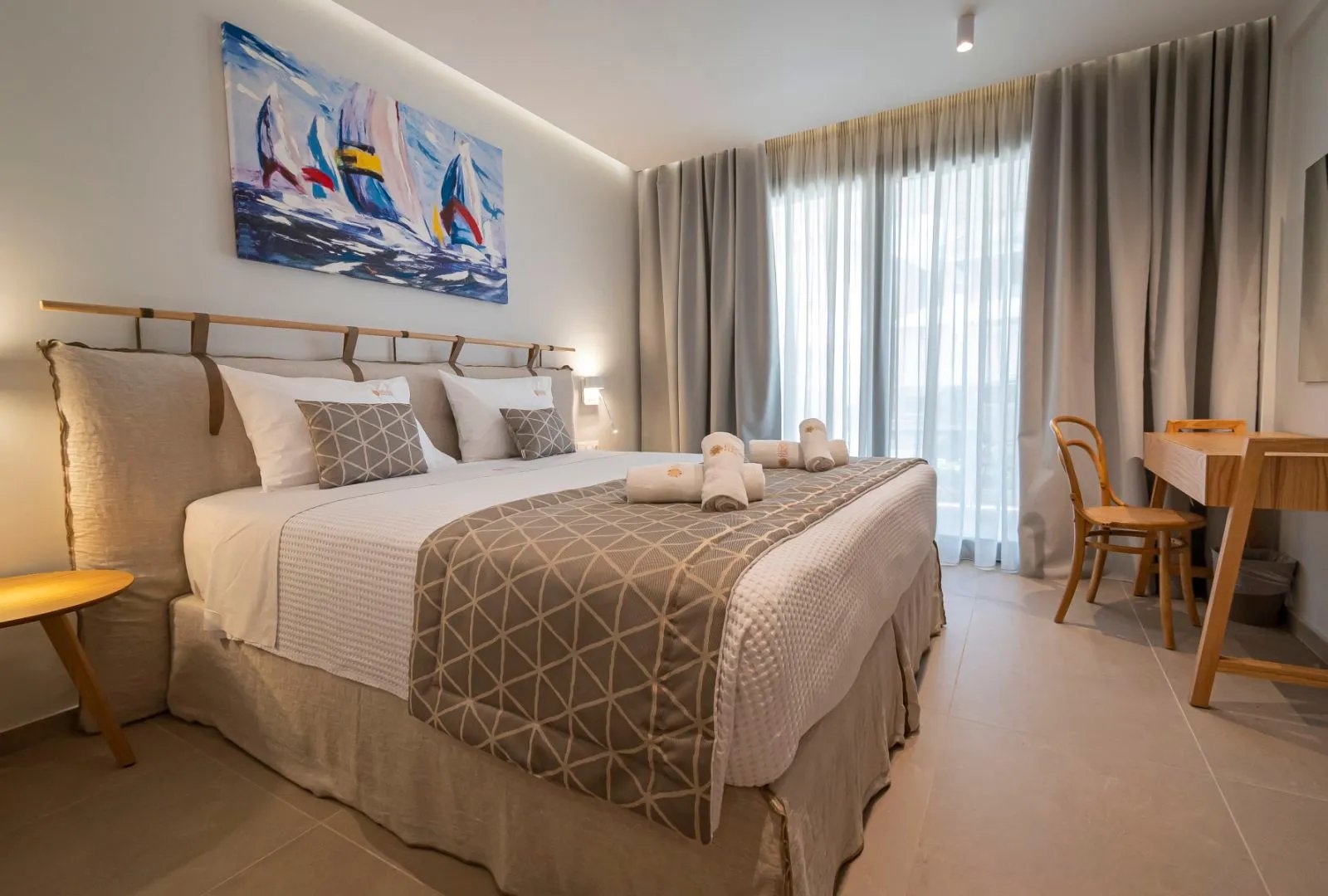 Το Double Room with City View βρίσκεται στο ισόγειο και διαθέτει ιδιωτικό μπαλκόνι με θέα σε έναν ήσυχο δρόμο της πόλης. Το δωμάτιο μπορεί να διαμορφωθεί με king-size ή δύο μονά κρεβάτια, προσφέροντας άνετη και ήρεμη διαμονή για ζευγάρια ή δύο επισκέπτες.